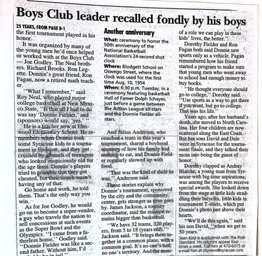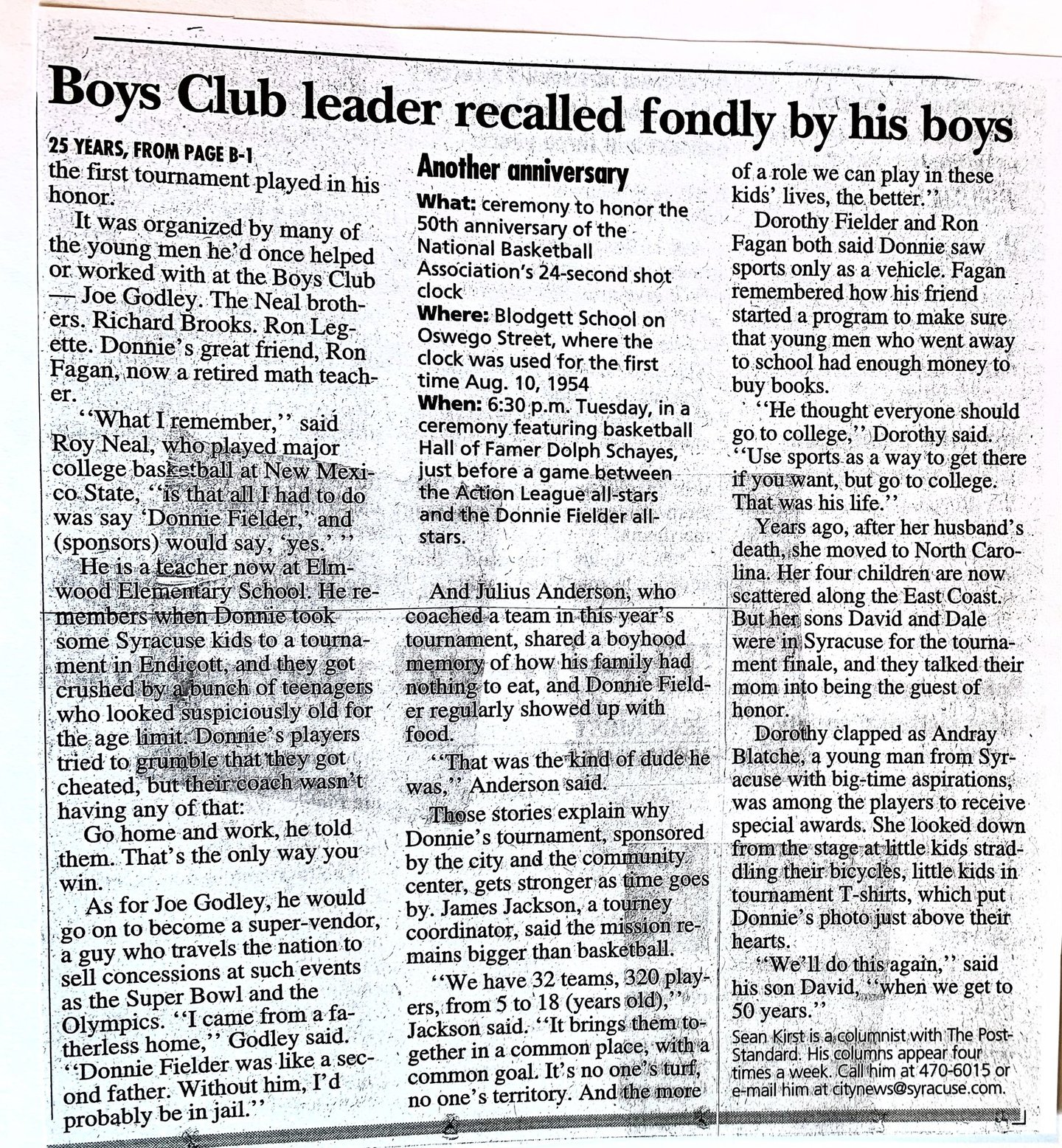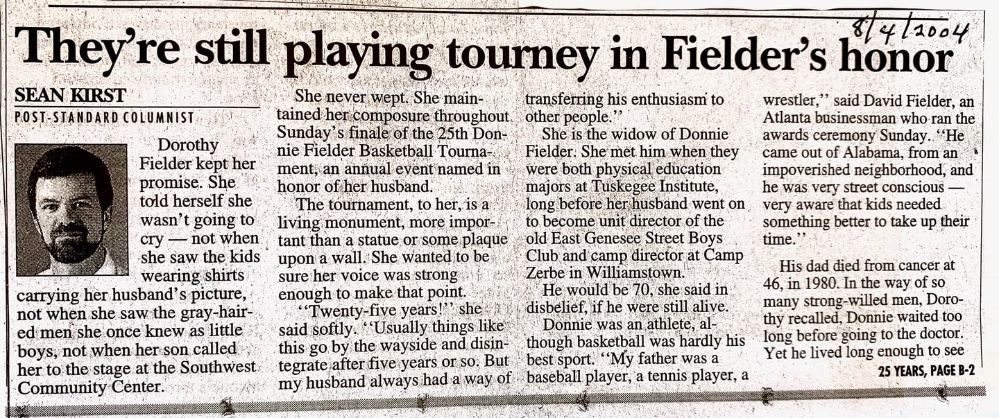 Kirst, Sean (2004, August 4). They’re still playing tourney in Fielder’s name: Boys Club leader recalled fondly by his boys. Syracuse Post- Standard pp. B1-B2.